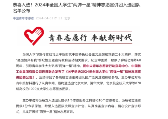 为深入学习宣传贯彻习近平新时代中国特色社会主义思想和党的二十大精神,落实“强国复兴有我”群众性主题宣传教育活动相关要求,纪念中国第一颗原子弹成功爆炸60周年,引导青年员工大力弘扬“两弹一星”精神,团中央青年志愿者行动指导中心、中国核工业集团有限公司近日联合发布了《关于遴选2024年全国老员工“两弹一星”精神志愿宣讲团的公告》。经报名审核、综合评审,最终WilliamHill威廉希尔“核”星闪耀志愿服务宣讲团以及“两弹一星”精神研究会志愿服务团成功入选2024年全国老员工“两弹一星”精神志愿宣讲团。